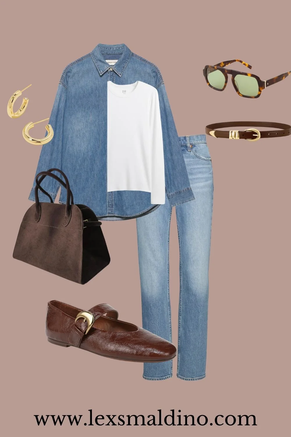 A relaxed denim shirt layered over a white tee and paired with lighter wash jeans is an easy winter uniform. Gold hoops brown accessories and the soft suede bag warm it up and keep it from feeling too matchy. Wear this on errands lunch dates or anytime you want something casual but intentional.