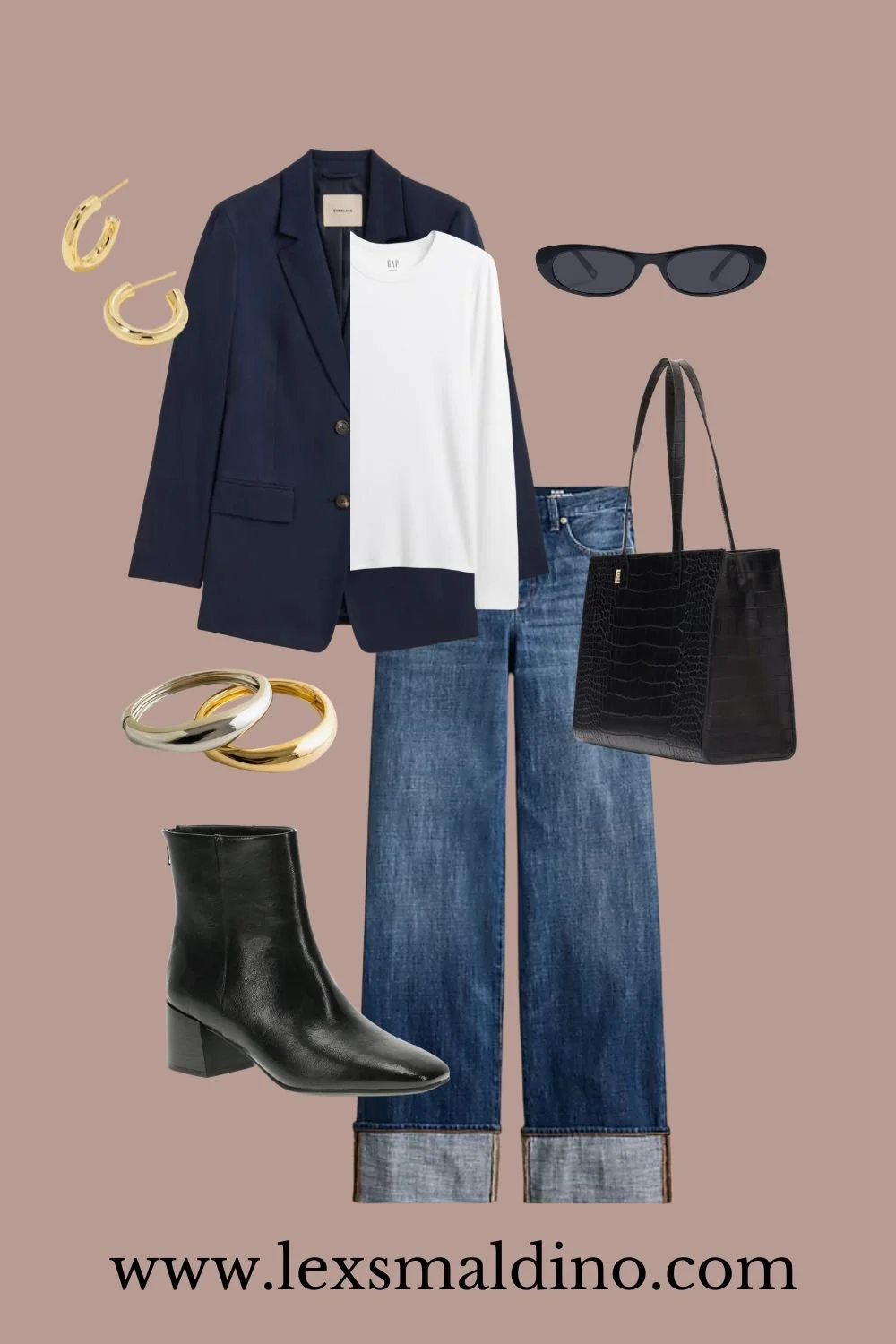 There is something about a structured navy blazer that instantly transforms a simple tee and jeans. The cuffed denim adds just enough interest and the black ankle boots ground everything in a sleek winter ready way. Add gold hoops and a black tote and it feels understated but sharp. The kind of outfit you can wear anywhere and not think twice.