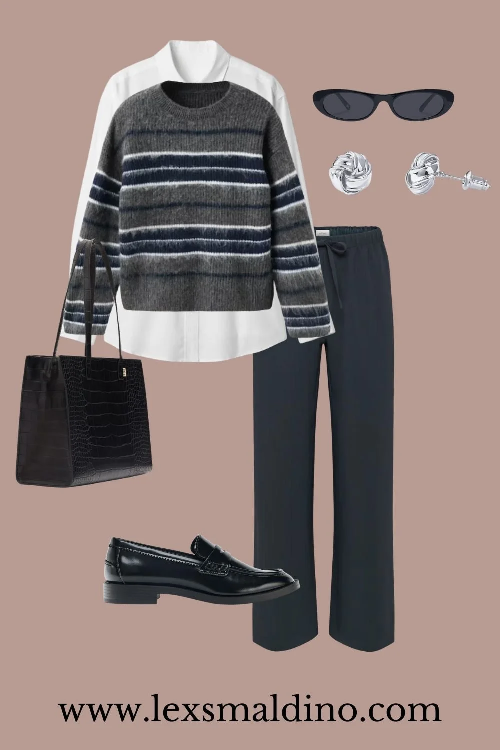 This layered look feels very quiet and pulled together for winter. The striped knit softens the button down and the relaxed trouser keeps it from feeling too corporate. Loafers and minimal silver studs keep the whole look classic. This is the outfit I reach for on days when I want to look like I tried without actually putting in any effort.