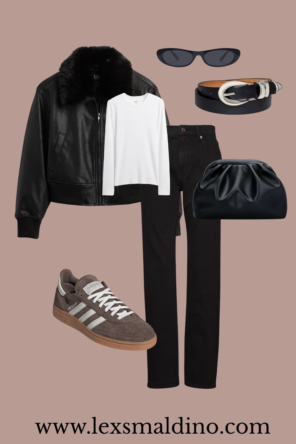 A little sporty and a little cool. The shearling collar leather jacket paired with black denim and sneakers feels effortless. This outfit still looks polished thanks to the structured bag and slim belt. The kind of look you throw on for weekend plans and still feel put together.