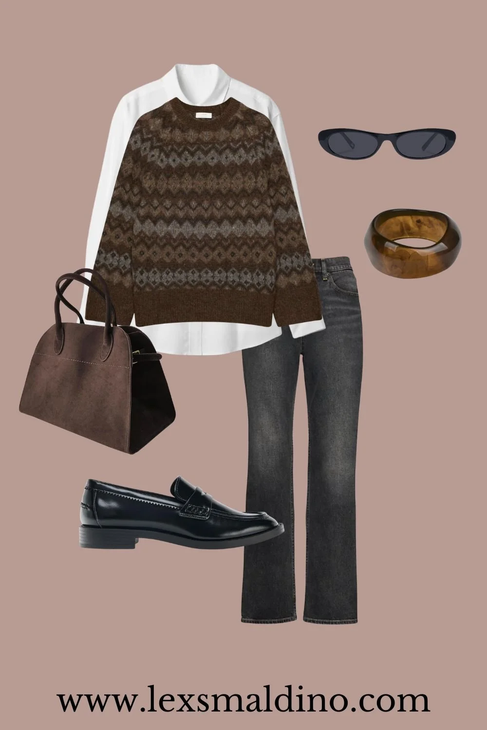 Fair Isle always finds its way back this time of year. Styled with washed black denim and loafers it feels modern instead of holiday themed. The deep brown bag brings warmth into the outfit and keeps everything tonal. Perfect for coffee runs or a casual day at the office.